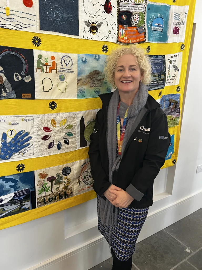The quilt, titled Interwoven / Fite Fuaite, is a joint initiative of the Mary Robinson Centre in Ballina and Project Dandelion. 51 organisations from across Ireland and Northern Ireland, including environmental advocates, women’s groups, and national organisations such as Birdwatch Ireland and the Irish Countrywomen’s Association, created individual squares for the project.